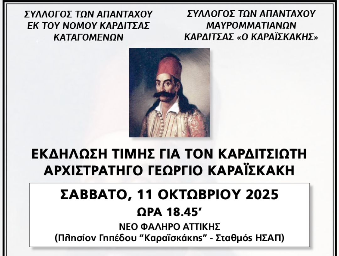 Ο Σύλλογος των Απανταχού εκ του Νομού Καρδίτσας καταγομένων και ο Σύλλογος των Απανταχού Μαυρομματιανών Καρδίτσας «Ο Καραϊσκάκης» προσκαλούν όλους τους Καρδιτσιώτες και τους Θεσσαλούς του Λεκανοπεδίου Αττικής-Πειραιά, το Σάββατο, 11 Οκτωβρίου 2025 και ώρα 18.45’ στην εκδήλωση τιμής που θα πραγματοποιηθεί στο Μνημείο όπου φυλάσσονται τα οστά του Καρδιτσιώτη Αρχιστράτηγου, Γεωργίου Καραϊσκάκη, στο Νέο Φάληρο Αττικής (πλησίον Γηπέδου Ολυμπιακού «Γεώργιος Καραϊσκάκης» – σταθμού Η.Σ.Α.Π. «Νέο Φάληρο»).