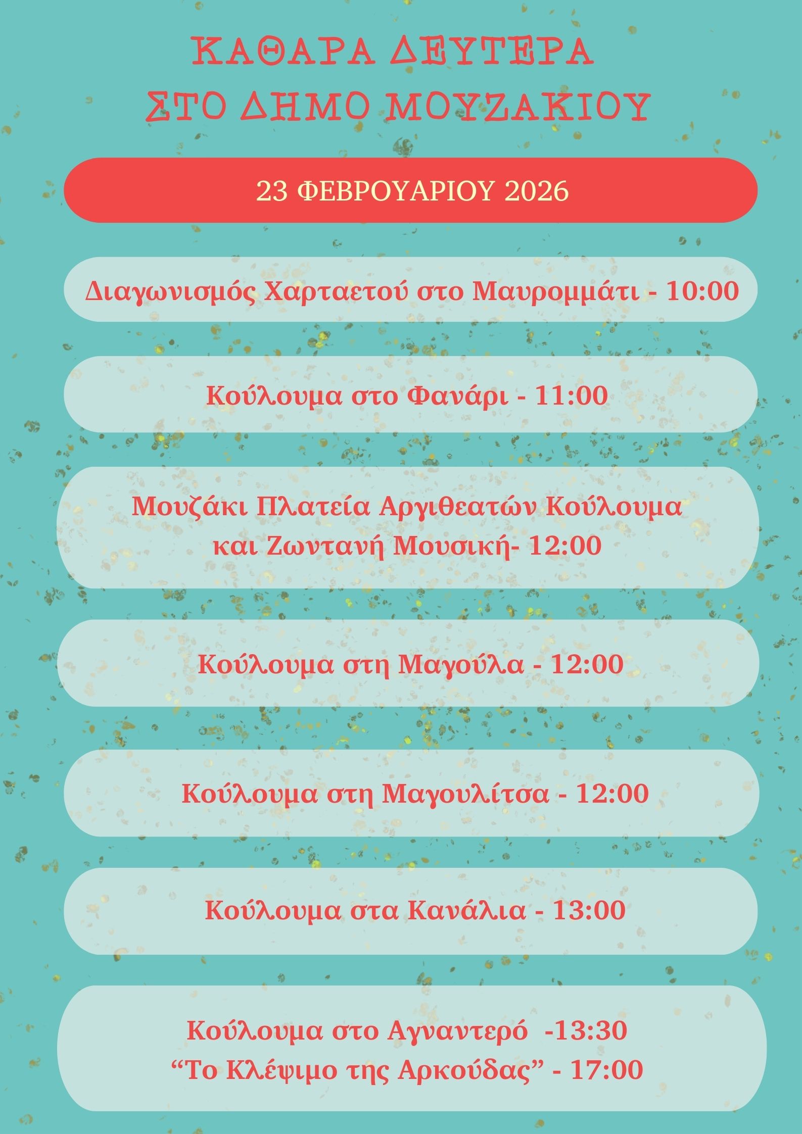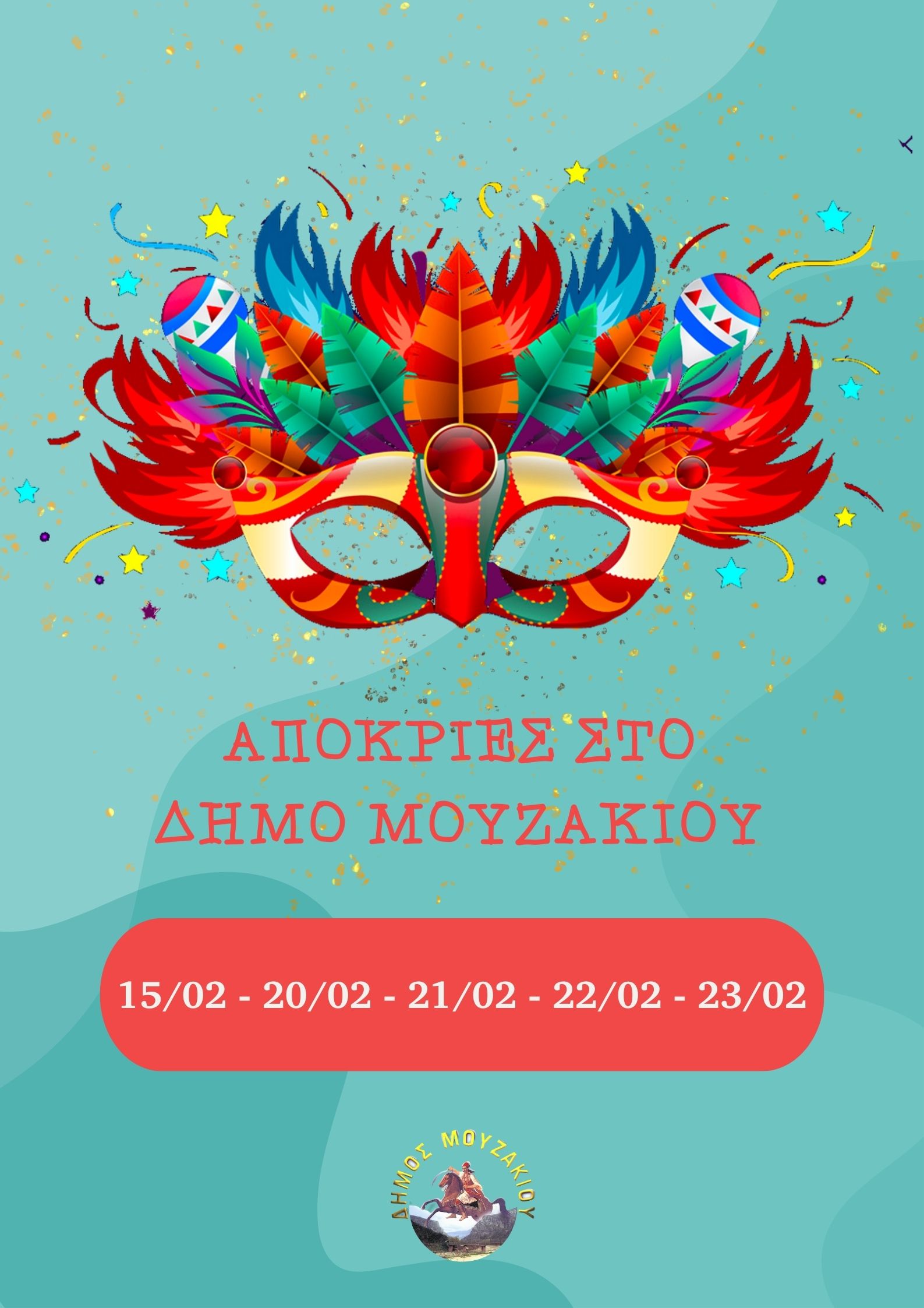 Ο Δήμος Μουζακίου και η Αντιδήμαρχος Πολιτισμού κ.Μαρία Καραμπέκου προσκαλούν όλους τους δημότες και επισκέπτες να συμμετάσχουν στις εκδηλώσεις και να γιορτάσουν τις Απόκριες και την Καθαρά Δευτέρα με παραδοσιακά έθιμα, μουσική, θέατρο και γλέντι.