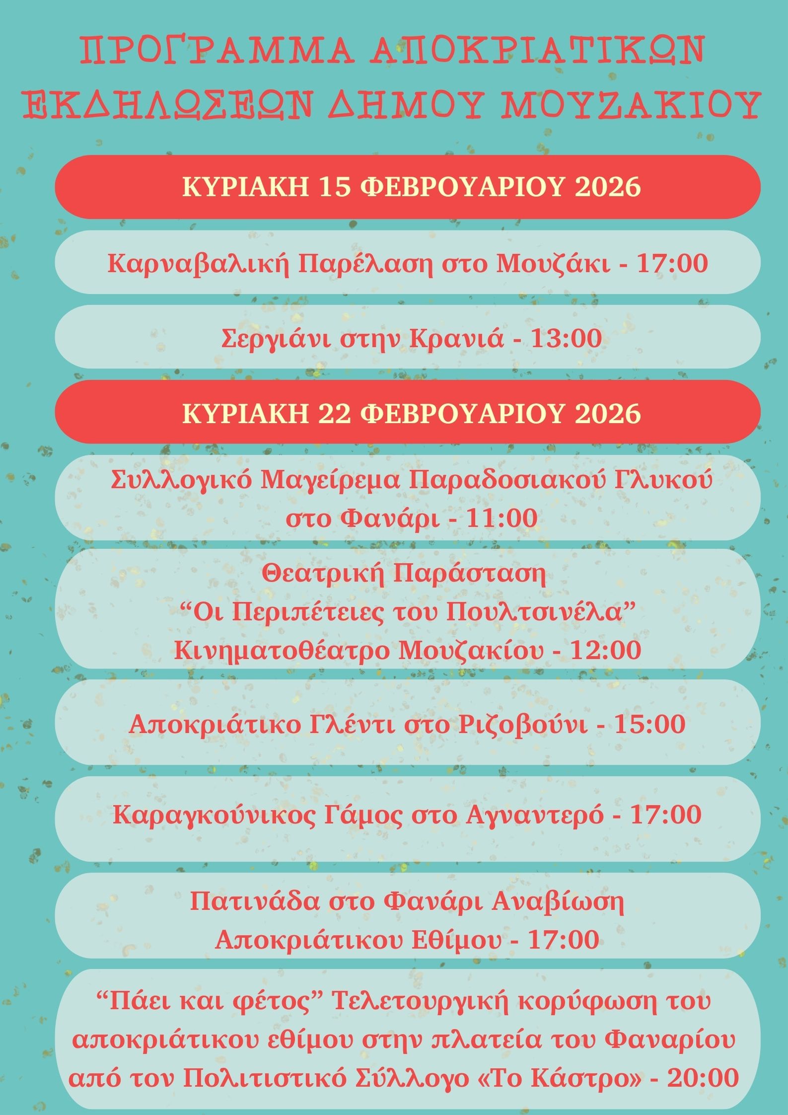Ο Δήμος Μουζακίου ανακοινώνει το πρόγραμμα των Αποκριάτικων Εκδηλώσεων 2026 σε συνεργασία με Πολιτιστικούς Συλλόγους και φορείς της περιοχής, το οποίο περιλαμβάνει δράσεις και δρώμενα για μικρούς και μεγάλους σε διάφορα χωριά του Δήμου, κορυφώνοντας το γιορτινό κλίμα των Αποκριών και της Καθαράς Δευτέρας.